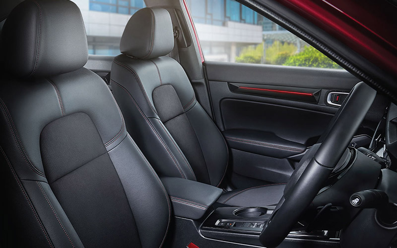 Kenyamanan dari material berkualitas serta sensasi mobil yang lebih sporty menjadikan kabin All New Honda Civic RS terasa lebih berkelas dan cocok untuk mendukung gaya hidup penggunanya yang aktif. Hal ini terlihat dari Door Armrest with Red Stitches serta Suede-Leather Combi Trimmed Seat with Red Stitches yang dikombinasikan dengan Door trim with Red Illumination. Semua fitur tersebut dilengkapi dengan Leather Wrapped Shift Knob and Steering Wheel, LED Map Light, serta tambahan USB port pada kabin bagian belakang.