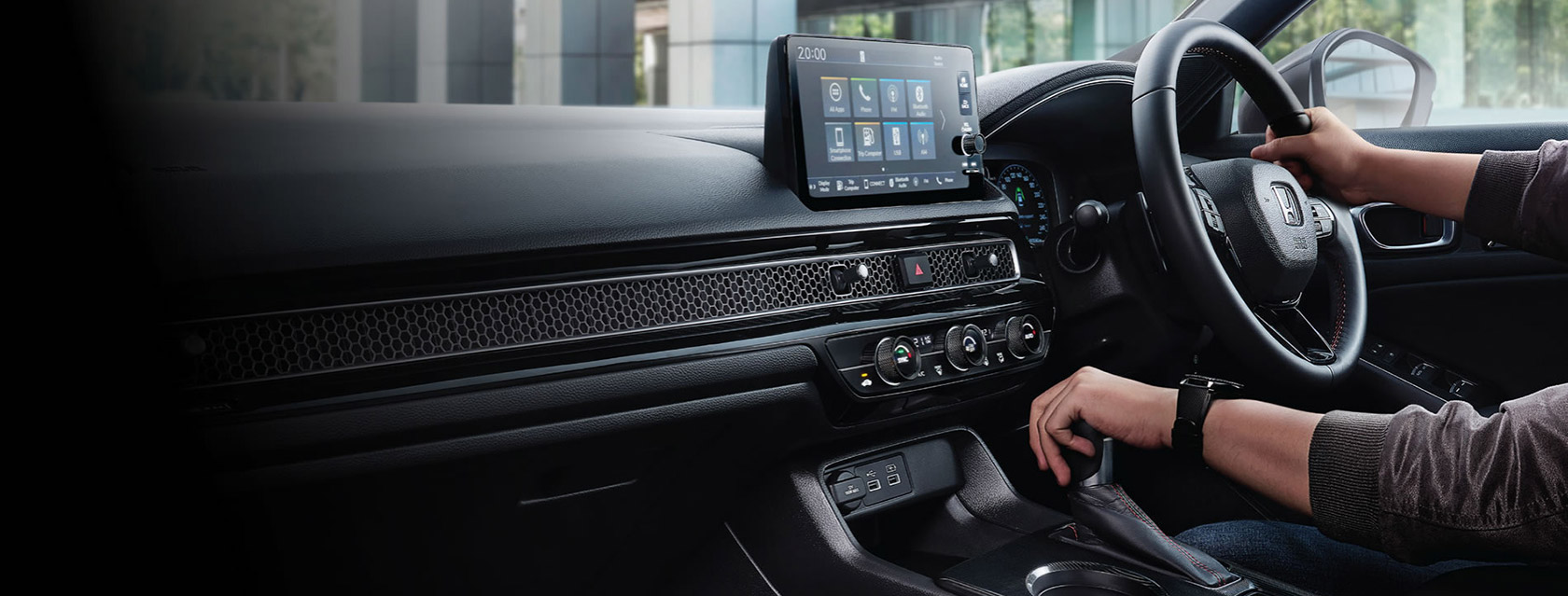 Masih pada bagian depan kabin, aksen honeycomb berbahan logam yang membentang pada dashboard meningkatkan kesan mewah yang berfungsi sebagai garis pemisah visual antara 9" Advanced Capacitive Touchscreen Display Audio dan panel kontrol A/C yang berubah menjadi Dual Zone Auto A/C yang berfungsi sebagai pengaturan suhu antara pengendara dan penumpang depan secara terpisah.